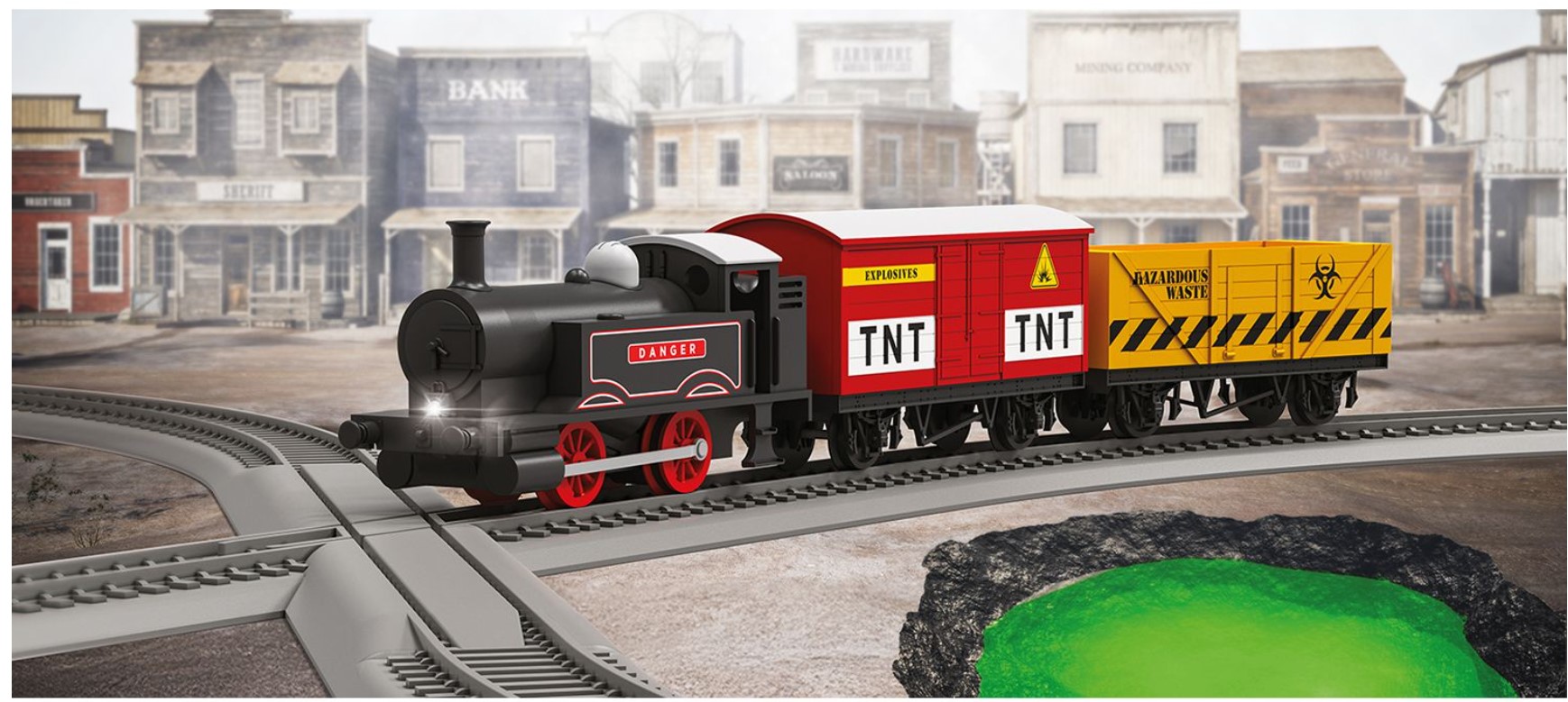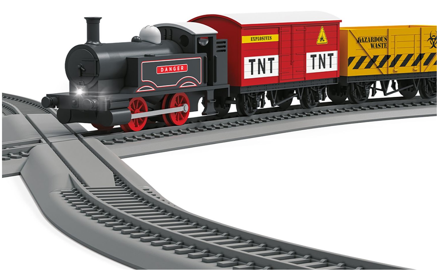 Discover the magic of steam railways with the newly developed R9361M Playtrains Steam Goods Express Train Set but watch out as the toxic wagon comes running past!