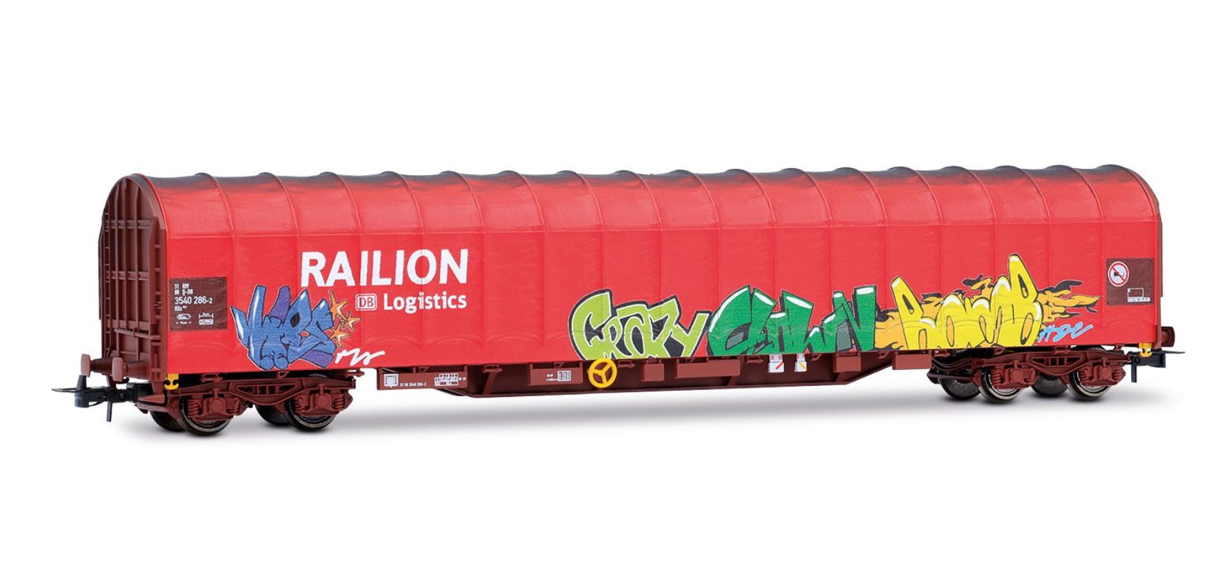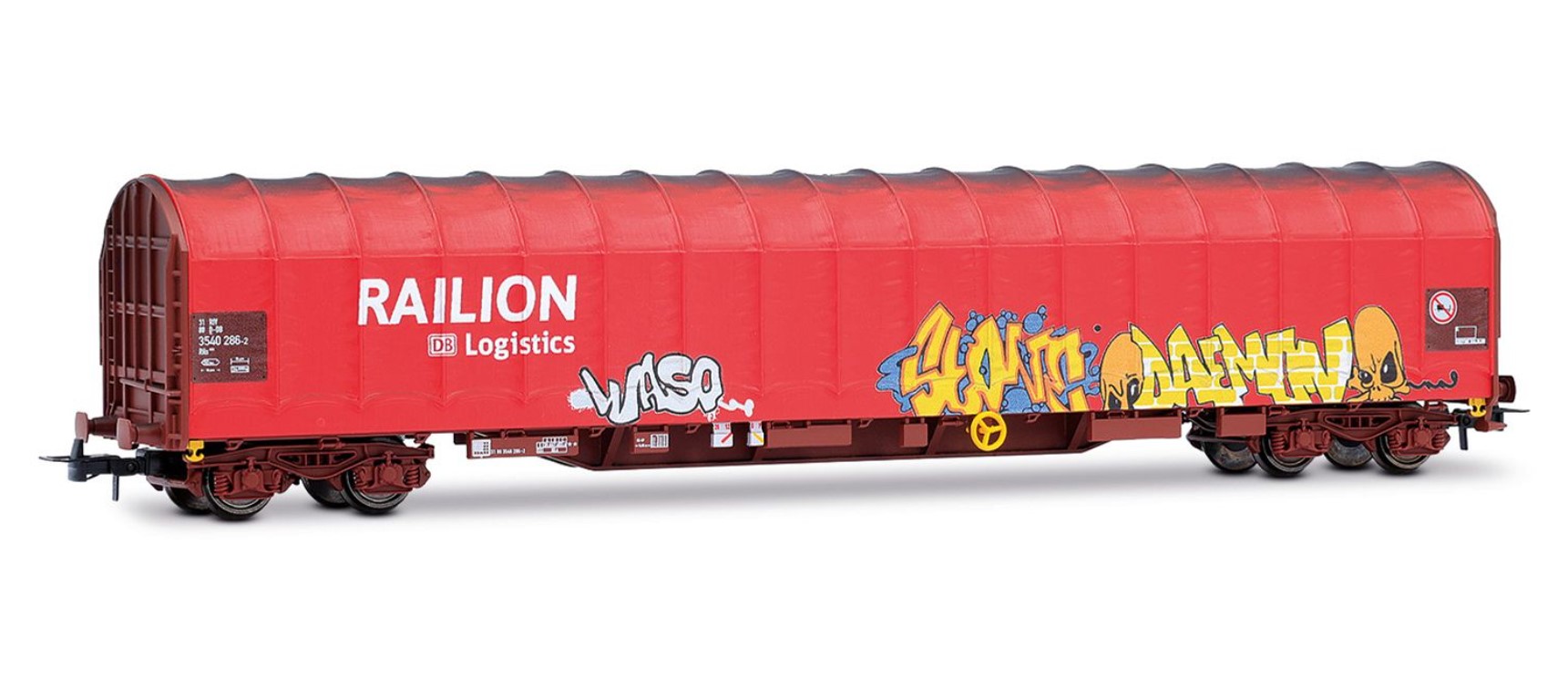 DB AG, 4-axle tarpaulin wagon "RAILION DB LOGISTICS", Rils type, red livery with graffiti, ep. V-VI.