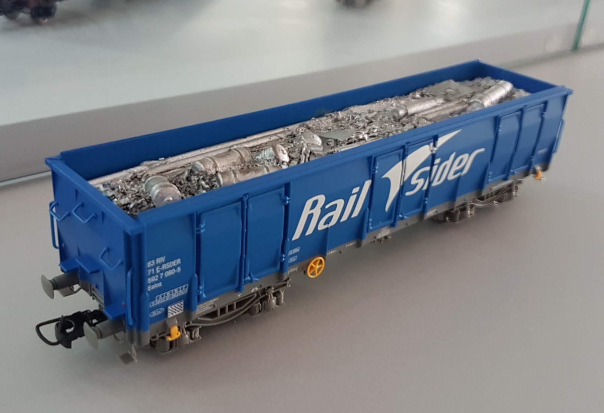 Vagon gondola tip Ealos, incarcat cu fier vechi, RailSider.